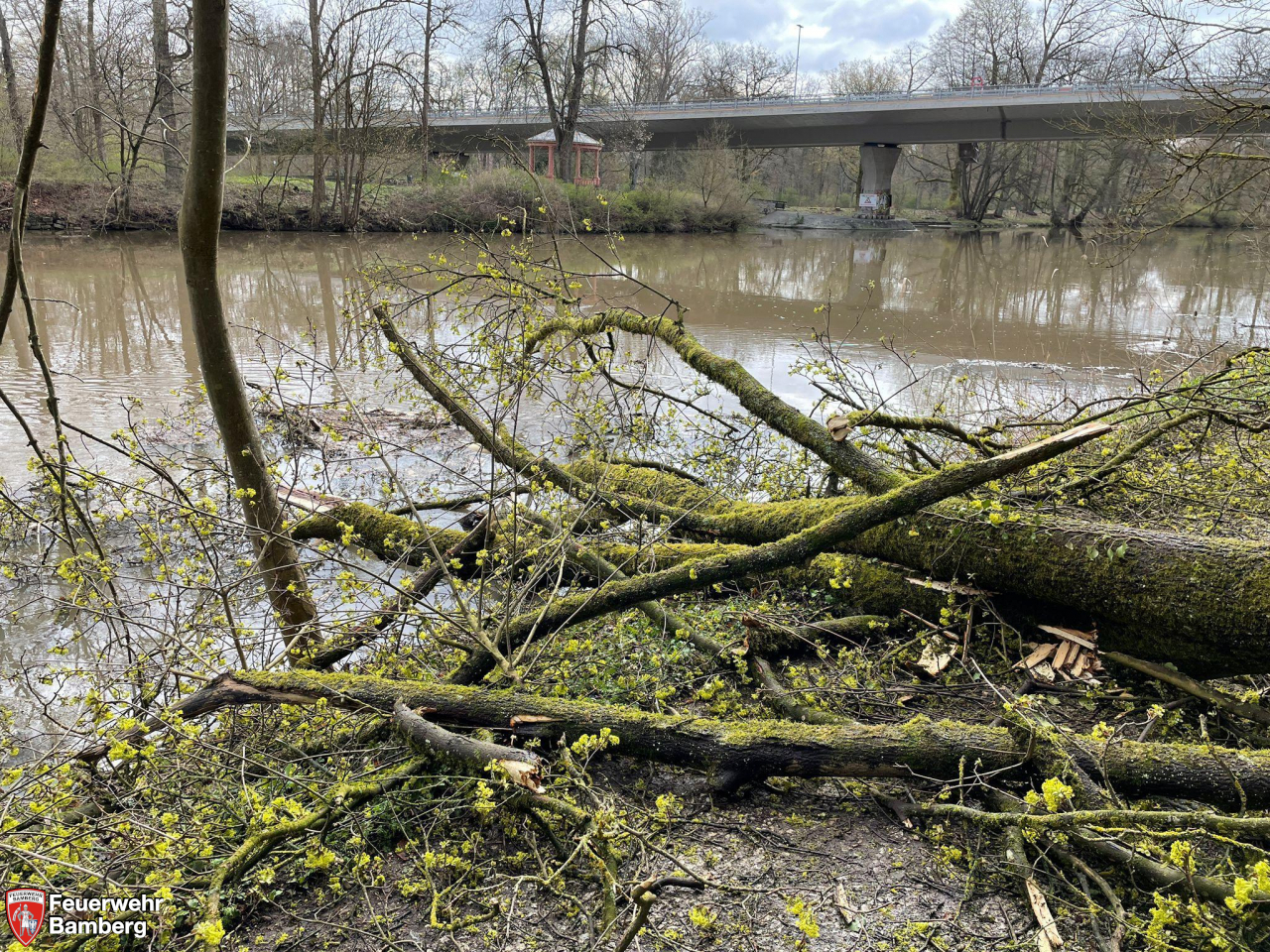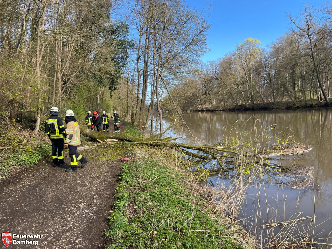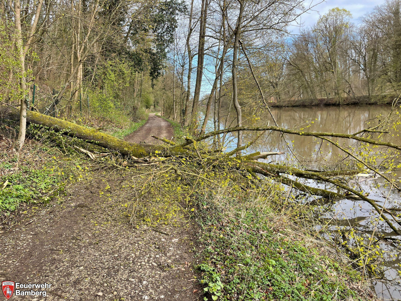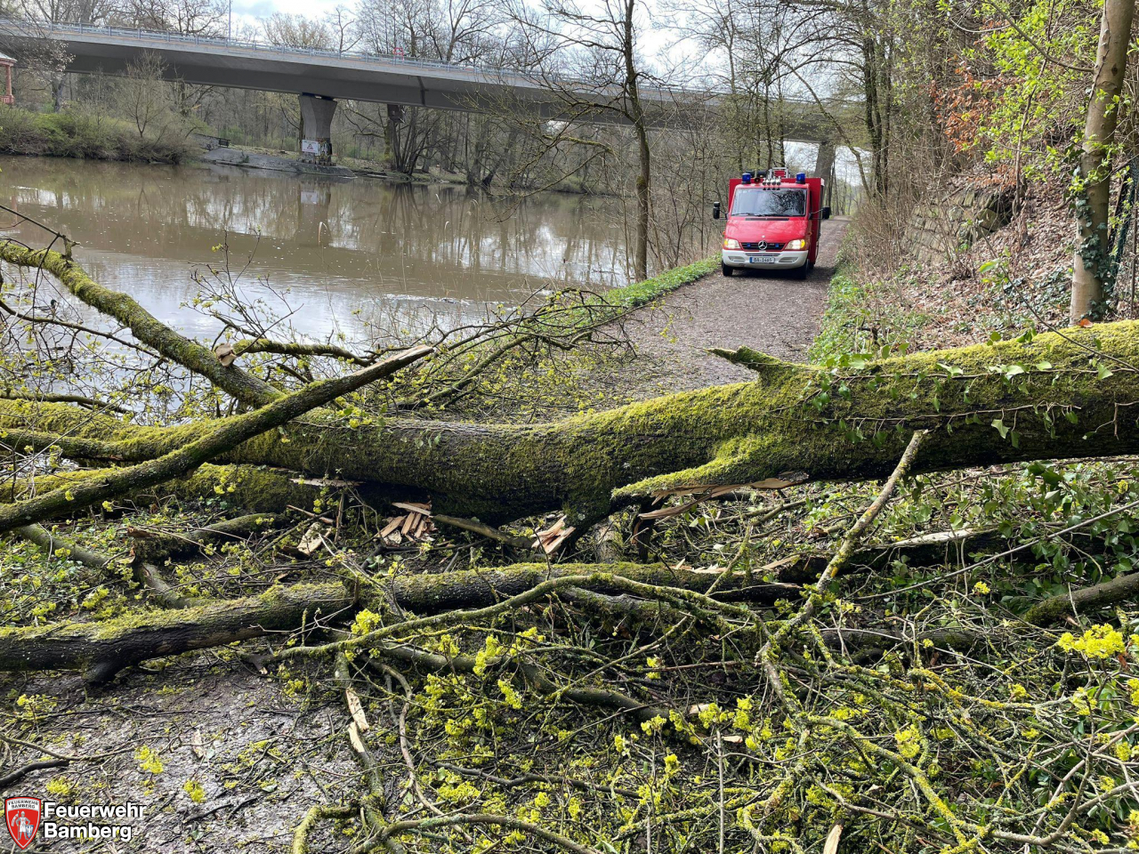 Die Feuerwehr Bamberg wurde am Sonntag Vormittag erneut an den Oberen Leinritt alarmiert, da hier ein weiterer Baum der Schwerkraft zum Opfer gefallen ist. An gleicher Stelle stürzte am Vortag schon einmal ein Baum auf den Uferweg.