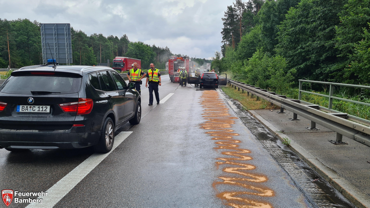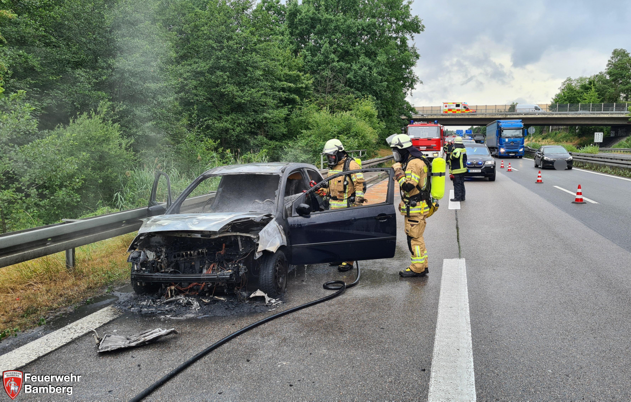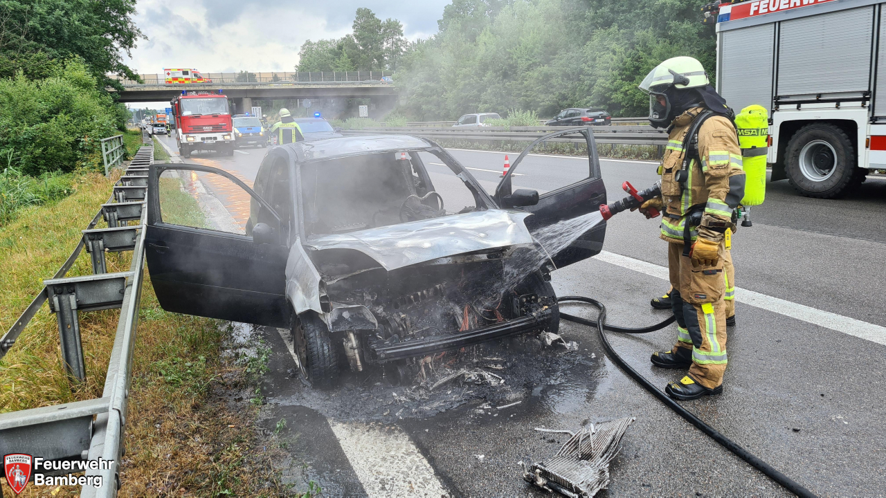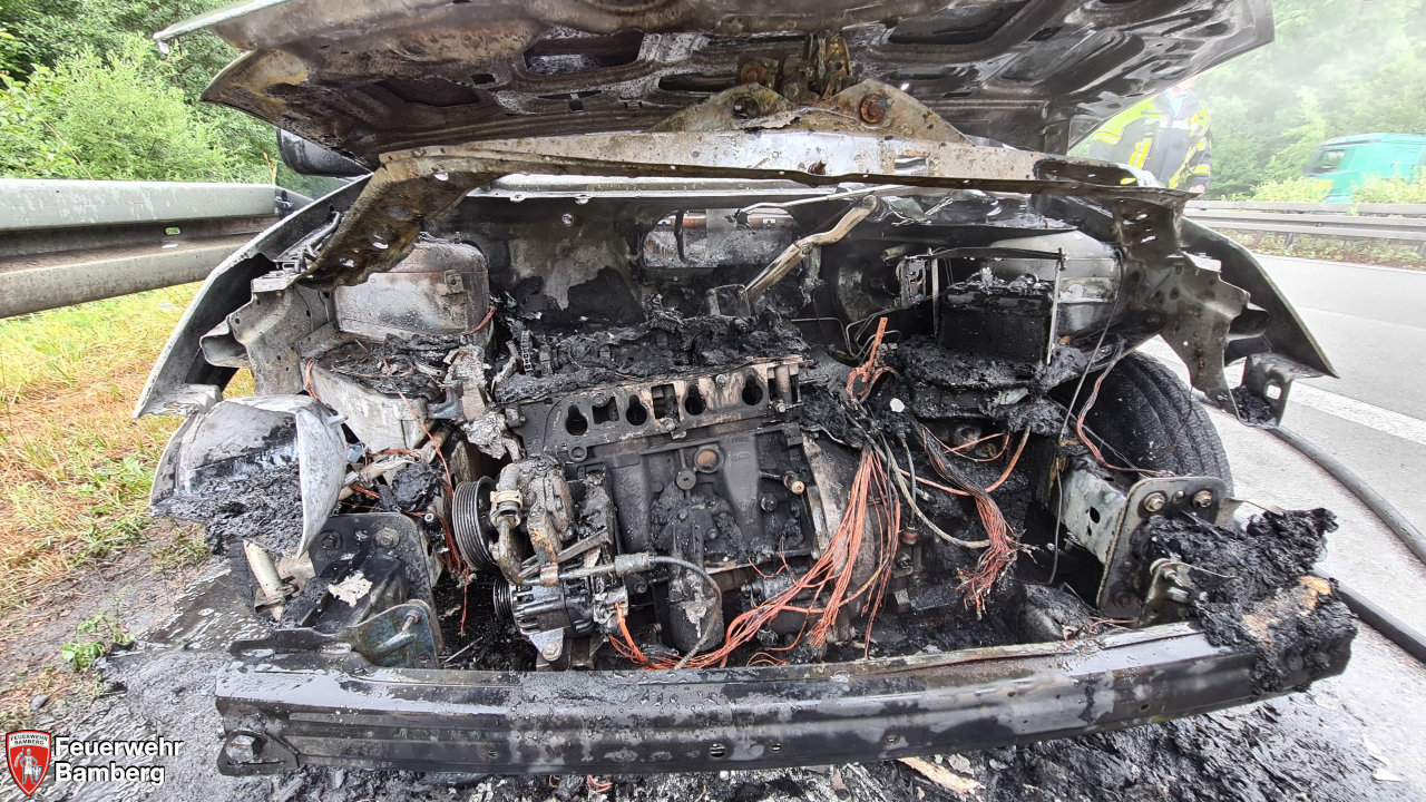Die Feuerwehr Bamberg wurde am Nachmittag zu einem brennenden Pkw auf die A 73 kurz nach der Auffahrt Memmselsdorf Richtung Süden alarmiert. Das Fahrzeug stand am Ende der Beschleunigungsspur auf dem Standstreifen, die Fahrgäste waren bereits ausgestiegen. Der Motorraum brannte in voller Ausdehnung und das Feuer griff bereits auf den Fahrgastraum über. Die ersteintreffenden Kräfte übernahmen die Verkehrsabsicherung und führten den Löschangriff durch. Die Löschgruppe 1 erweiterte die Verkehrsabsicherung und öffnete mittels hydraulischem Spreizer die Heckklappe, um eine Brandausdehnung auf den Kofferraum ausschließen zu können.
