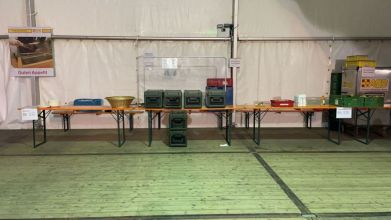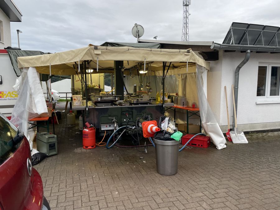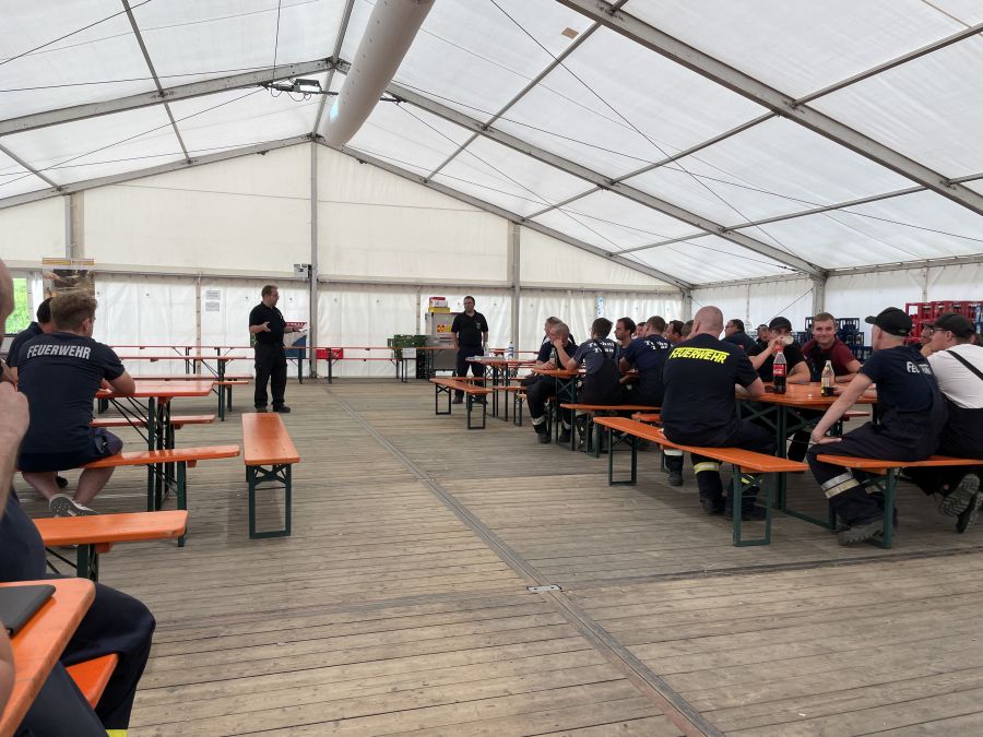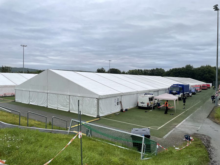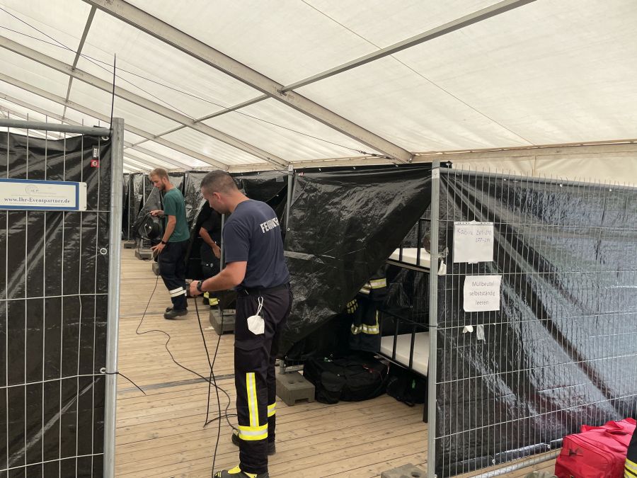 In dieser kleinen „Helferstadt“ sind insgesamt 100 Feuerwehrkräfte und 100 Kräfte des THW untergebracht und werden versorgt. Insgesamt ist die Unterkunft sehr gut organisiert und strukturiert, so dass sich die Helferinnen und Helfer täglich gut erholen und auf den nächsten Tag vorbereiten können.