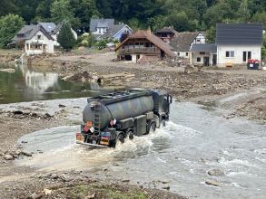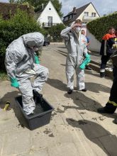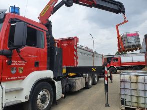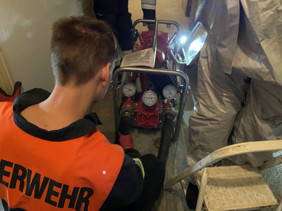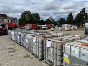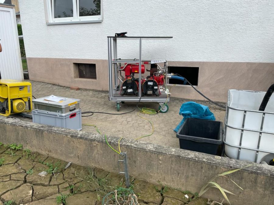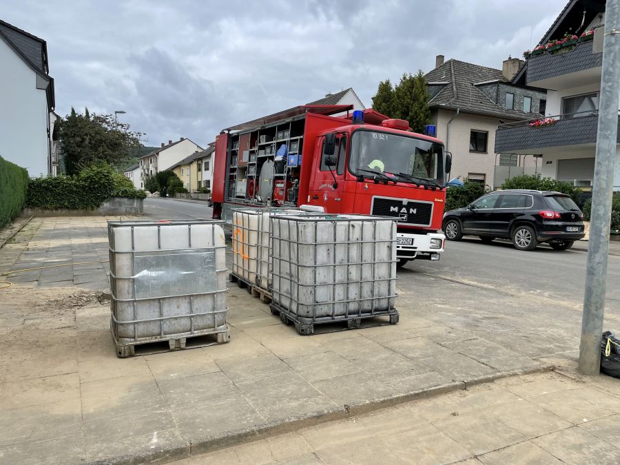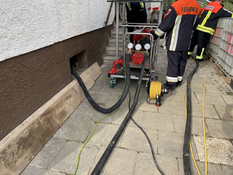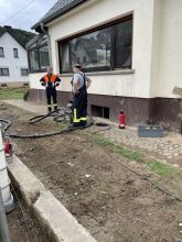 Etliche Keller im Einsatzgebiet waren nach wie vor vollgelaufen und die Heizöltanks der Häuser waren ebenfalls noch befüllt. Um hier entsprechend sicher vorgehen zu können, mussten sich die Kameradinnen und Kameraden zusätzlich zur Einsatzkleidung noch weitere Schutzausrüstung wie Overall, Schutzbrille und Spezialhandschuhe anziehen, um eine Kontamination mit den Ölen zu vermeiden. So wurden über den Tag verteilt bis ca. 18:30 Uhr mit Spezialpumpen mehrere Öltanks in etliche IBC-Container à 1.000 Liter (gesamt ca. 28.000 Liter) umgepumpt und zum Sammelplatz verbracht.