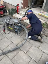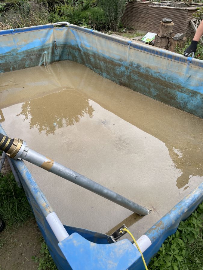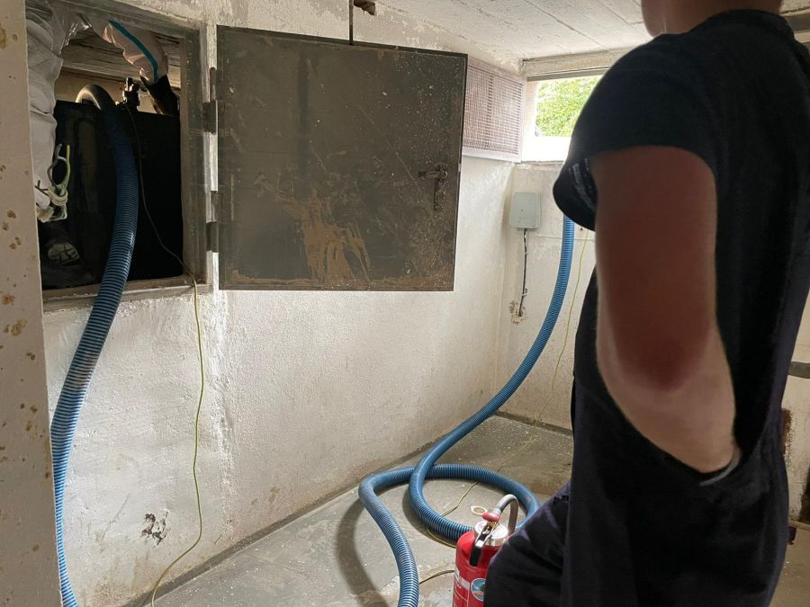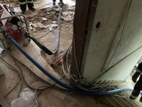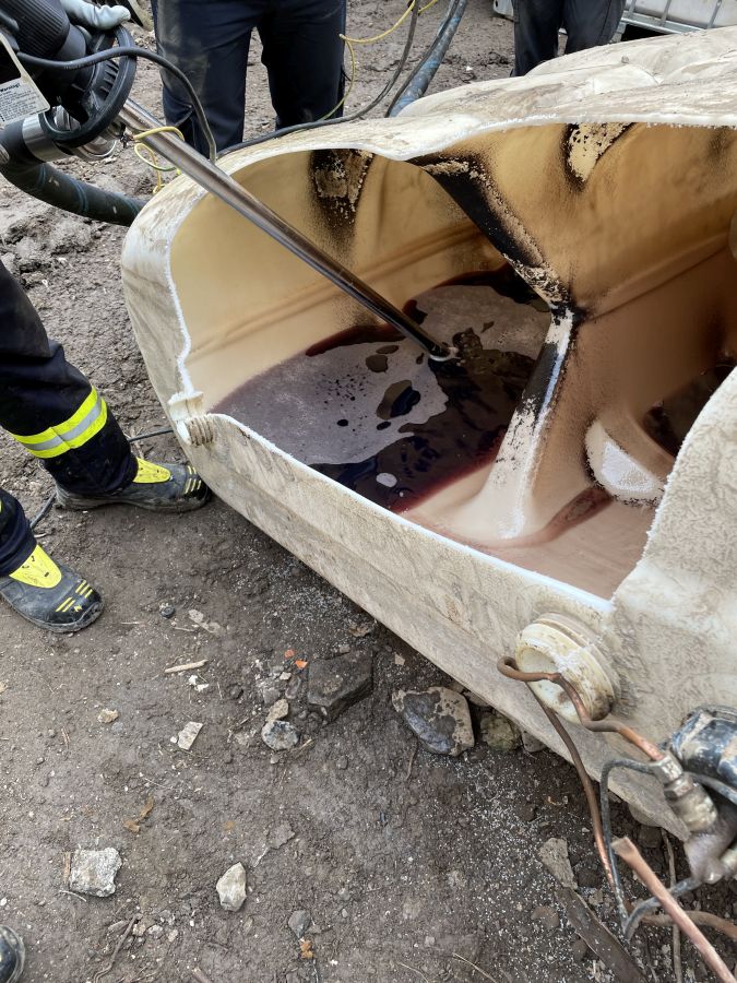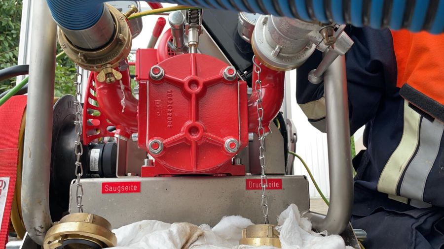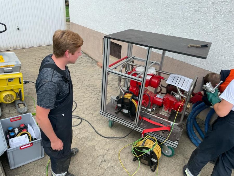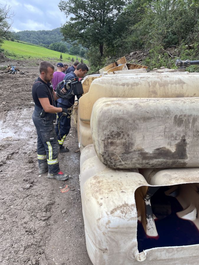 Am vorletzten Arbeitstag konnten die Kameradinnen und Kameraden wieder große Hilfe leisten: an ca. 130 Pumpstellen konnten sie etwa 120.000 Liter Öl umpumpen. Dies konnte mittels der fünf im Einsatz befindlichen Pumpen gemeistert werden. Die Pumpen unterschiedlicher Hersteller schaffen zwischen 200 und 250 Liter in der Minute und können bei größeren und kleineren Mengen eingesetzt werden. So wurden nicht nur Öltanks „angegriffen“, sondern auch kleinere Behältnisse teilweise mit Öl-Wasser-Gemisch. Um an die genauen Einsatzstellen zu kommen, bedeutet es aber Schwerstarbeit. Die teilweise bis zu 120kg wiegenden Pumpen müssen des Öfteren durch unwegsames Gelände von Hand getragen werden, was grundsätzlich Potential für Verletzungen birgt. Während der gesamten Arbeiten muss darauf geachtet werden, dass dies funkenfrei vonstattengeht.