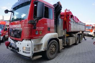 Nach Pausen und langer Fahrt in der Kolonne trafen die Fahrzeuge gegen 16:30 Uhr bei ihrer Unterkunft vor Ort ein. Nun galt es noch als Tagesaufgabe diese für die kommende Woche vorzubereiten und sich in die Einsatzlage vor Ort detailliert einweisen zu lassen. Etwa 80 Einsatzstellen sind bislang noch nicht erkundet. Zudem liegt der Aufgabenschwerpunkt beim Abpumpen von Heizöl aus Kellern und Heizöltanks, sowie das Befreien der Keller von Schlamm und Dreck.