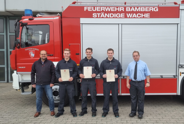 Grund zum Glückwunsch gab es am Freitag, den 30.09. vom stellvertretenden Amtsleiter des Personal- & Organisationsamtes der Stadt Bamberg Herrn Christian Czoncz. Denn mit Wirkung zum 1. Oktober wurden die seit 01.09.2021 eingestellten Brandmeisteranwärter Marcel Bauer, Jonas Erhardt und Florian Friedmann zum Brandmeister im Beamtenverhältnis auf Probe ernannt. Die Urkundenaushändigung erfolgte in der Feuerwache Margaretendamm im Rahmen des letzten Schichtwechsels der Ständigen Wache im September.