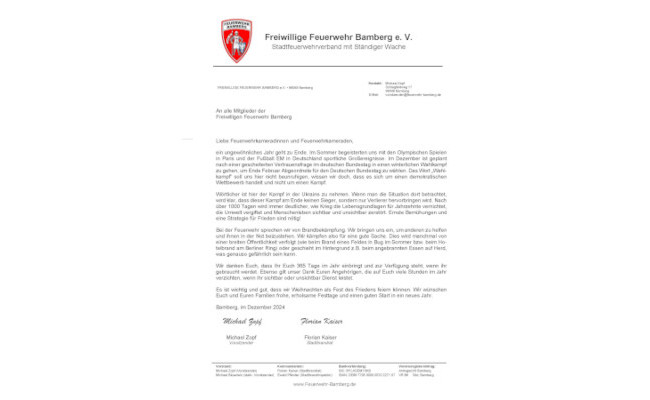 Seit knapp zweieinhalb Jahren herrscht in der Ukraine der Ausnahmezustand. Seit Beginn des russischen Angriffskriegs ist die Ukraine auf die unterschiedlichsten Hilfen angewiesen. Bereits in den Vorjahren wurden Transportfahrten mit Sachspenden durch die Feuerwehr Bamberg unterstützt. Sei es in der Vorbereitung, der Verladung oder gar beim Sammeltransport im Zuge der Organisation durch den Landesfeuerwehrverbandes Bayern e.V. gewesen.