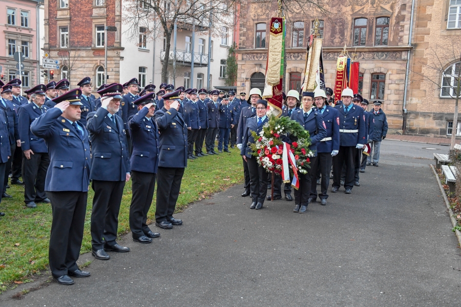 Bereits in den frühen Morgenstunden versammelten sich über 150 Mitglieder der Bamberger Wehr, Ehrengäste und Vertreter befreundeter Hilfsorganisationen an der Weide, um zum Totengedenken anzutreten. Unter den Gästen waren die Bürgermeister Dr. Christian Lange und Wolfgang Metzner, sowie einige Vertreterinnen und Vertreter des Bamberger Stadtrates und auch Abordnungen der Patenwehr aus Buttenheim und der Wehr aus der österreichischen Partnerstadt Villach. Mit musikalischer Begleitung des Blasmusikvereins Oberhaid marschierte der Zug sodann auf den Domberg. Der sich anschließende Gottesdienst unter der Leitung von Domdekan Dr. Hubert Schiebeck steigerte den festlichen Rahmen und betonte anschaulich die Einheit von christlicher Nächstenliebe und aktivem Feuerwehrdienst. Im Anschluss an den Gottesdienst erhielt die neue, im Landkreis Kulmbach hergestellte Vereinsfahne ihren kirchlichen Segen. Ein Austausch der Fahne war notwendig, da die aus dem Jahr 1964 stammende Fahne altersbedingte und mit den heutigen Mitteln irreparable Schäden aufweist. Aufgrund ihrer besonderen Aussage- und Symbolkraft entschieden sich die Verantwortlichen um Vorsitzenden der Feuerwehr Dr. Wolfgang Pfeuffer, die Motive – das Stadtwappen, Abbilder des Kaiserdoms, der Michelskirche und des Alten Rathauses sowie ein Bild des Hl. Florian, dem Schutzpatron der Feuerwehrleute – weitgehend unverändert zu übernehmen. Zentral ist und bleibt auch weiterhin der Wahlspruch „Gott zur Ehr‘ dem Nächsten zur Wehr“.