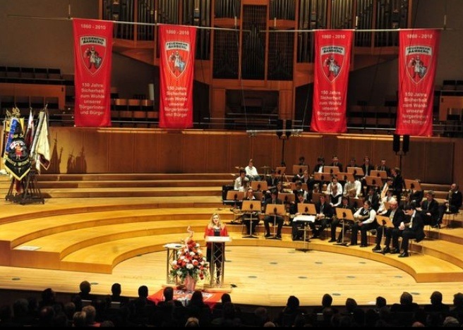 Nach der Totenehrung führte der Weg des Zuges zur Konzerthalle. Dort begingen etwa 530 Kameraden, Freunde und geladene Gäste die Feierlichtkeiten. Nach den Grußworten des Vorstandes der Feuerwehrvereins Dr. Wolfgang Pfeuffer begrüßte auch Oberbürgermeister Andreas Starke als Schirmherr, der zwischenzeitlich bei der Festversammlung eingetroffen war, die Anwesenden. Anschließend hielt Staatssekretärin Melanie Huml die Festrede.